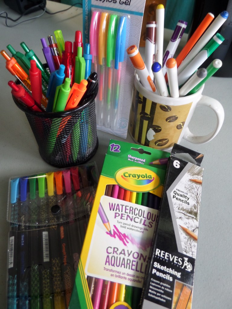 I suspect, of course, that writing and art materials were made better back then, and of course we labeled everything and were personally responsible for our own items. Remember scraping your pencils and writing your name on them? And wrapping your books carefully with covers made from the inside of brown paper grocery bags? And being expected to keep the contents of your desk neat and tidy? And keeping your pens and pencils and things in a sturdy wooden or tin box instead of a floppy pencil case?  (What? You aren’t as old as me?). Then we were expected to respect other students’ things—and if we didn’t, we’d be sent to the office where the principal had that long leather strap hanging on the wall… (Okay, so maybe not everything was perfect back in the day, but still…).