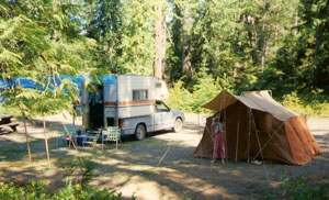 I have few memories of my early years, but dad’s other passion, photography, proves that we did a lot of camping, right from the start. My first clear memory, though, took place the summer I turned seven. I had two younger brothers by then. We drove south from our home in the Okanagan Valley of British Columbia, across the border into United States. We drove through the mighty Grand Teton range of mountains, their jagged peaks covered in snow, and down to Salt Lake City, where we of course went to see the Mormon Tabernacle grounds. While there, arid Salt Lake City experienced a freak rainstorm, with 2 inches of rain falling in a few minutes. When we got back to our tent, which we had pitched by a lovely little stream, the stream had turned into a pond and our tent was floating! Needless to say, we spent a rather wet night! Then we went to Yellowstone Park. We arrived the day of my birthday. While Dad pitched the tent, mom started a campfire, so we could celebrate my birthday with a marshmallow roast. Mom was roasting a marshmallow, when it started to burn. As she pulled it away from the fire, it flew off the stick and stuck to my leg, still on fire! I started jumping up and down and screaming. My dad, hearing my wails, came running out of the tent, banging pot lids together and shouting at the top of his voice, sure that the bears had attacked me!