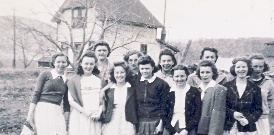 Between two of the women, one my Grandma and the other my Mommy, I perch on a tall stool, mesmerized, watching the women. Across the table, a young teenage girl stands. She licks the end of a long piece of thread, squinting as she pushes the thread through the needle eye. Then slowly and carefully she leans over to add her own over-and-under, over-and-under stitches to the design.